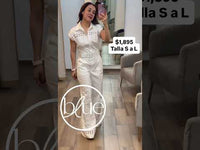 Este jumpsuit de manga corta combina estructura con detalles intrincados, con un cuello elegante y un llamativo bordado circular de inspiración azteca en el pecho. La cintura ceñida se acentúa con un llamativo cinturón blanco, creando una silueta definida. El diseño, que se integra con pantalones de pierna ancha, se repite en los puños, aportando un toque cohesivo y artístico. Combinando la sofisticación de la sastrería con un bordado llamativo, esta pieza es perfecta para cualquier ocasión