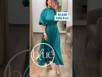 Descripción Este vestido turquesa con manga campana y escote alto combina frescura y elegancia. Su espalda descubierta con moño y tela ligera lo hacen ideal para eventos casuales o de día.